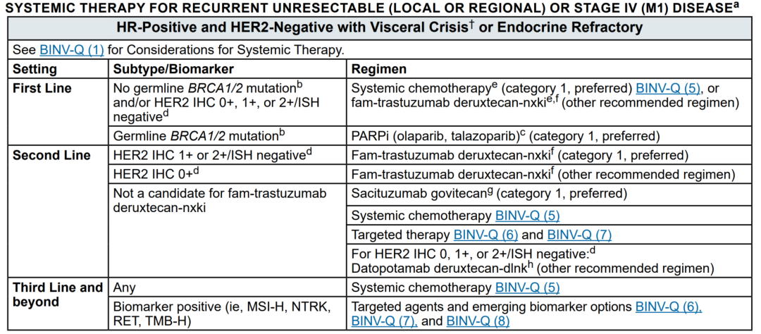 《NCCN指南2025v4》对内脏危象或ET耐药HR+/HER2-晚期乳腺癌治疗推荐