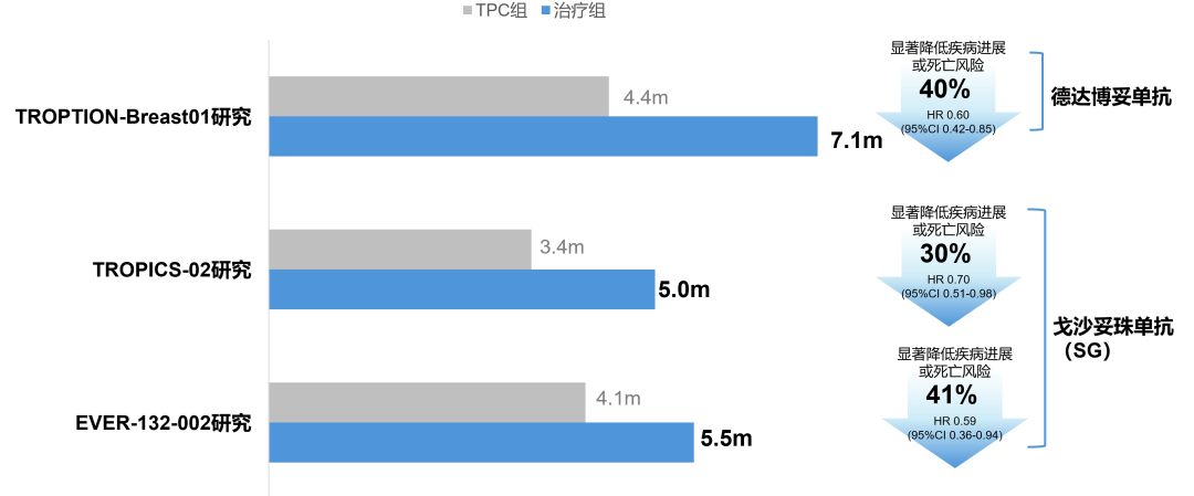 在针对HER2 IHC 0人群的疗效表现方面:TROPION-Breast01研究显示,Dato-DXd vs ICC的mPFS为7.1个月vs 4.4个月(HR,0.60,95%CI,0.42 to 0.85),显著降低40%的疾病进展或死亡风险[25]。TROPiCS-02研究中,SG vs TPC的mPFS为5.0个月vs 3.4个月(HR,0.70,95%CI,0.51 to 0.98),显著降低30%的疾病进展或死亡风险[26]。EVER-132-002研究中,SG与TPC的mPFS则为5.5个月vs 4.1个月(HR,0.59,95%CI,0.36 to 0.94),显著降低41%的疾病进展或死亡风险[18]