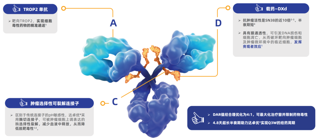 在细胞毒载荷方面,Dato-DXd的细胞毒载荷DXd的抗肿瘤活性约是SG的细胞毒载荷SN38的10倍,细胞毒作用更强。Dato-DXd的药物抗体比(DAR)为4,SG为7.6、芦康沙妥珠单抗(SKB264)为7.2,意味着Dato-DXd的治疗窗更大,可更好兼顾疗效与安全性。同时,Dato-DXd整体药物半衰期达4.8天,可每3周给药一次,较另外两种TROP2 ADC给药更加便利。