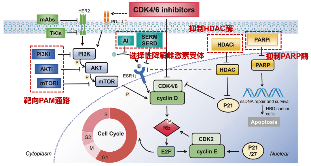 CDK4/6i跨线治疗目前仍存在比较大的争议,主要循证医学证据源于postMONARCH研究,显示CDK4/6i+ET跨线治疗的mPFS为6.0个月,优于ET对照组[3]。然而,其他多项CDK4/6i跨线挑战却宣告失败,该策略仍需更多研究、更大样本予以验证。在新型靶向治疗方面,临床应用则需生物标志物筛查,仅部分优势人群可以获益。如BYLieve研究中PI3K抑制剂+ET、CAPItello-291研究中AKT抑制剂+ET等所取得的mPFS为5.6个月~8.0个月,且只针对特定突变人群[4,5]。此外,在ET框架下,新型口服SERD、HDAC抑制剂也在不断探索,mPFS获益在3.8个月~7.4个月不等,尚无总生存期(OS)获益证据[6,7,8]