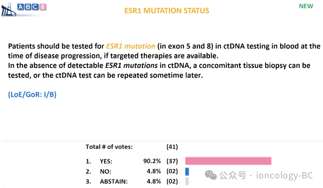 若存在相应的靶向治疗选择,应在疾病进展时通过血液ctDNA检测对患者进行ESR1突变(第5和第8外显子)筛查。