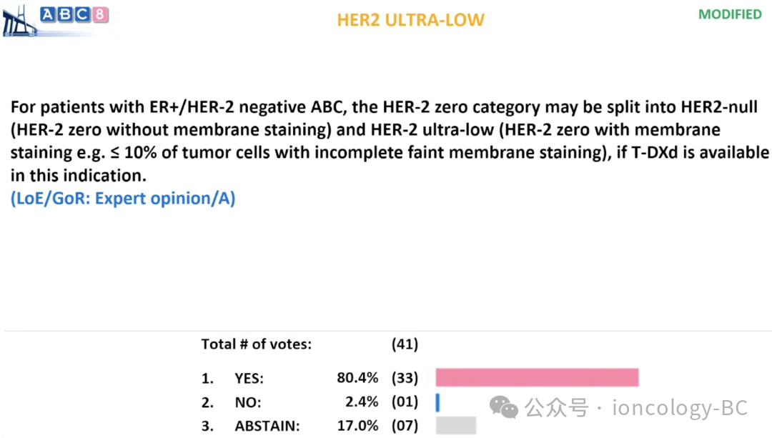 对于ER+/HER2-晚期乳腺癌患者,若T-DXd适用于该适应症,可将HER2 0类别进一步细分为:HER2无表达(无膜染色)和HER2超低表达(存在膜染色,例如<10%的肿瘤细胞呈现不完整微弱膜染色)