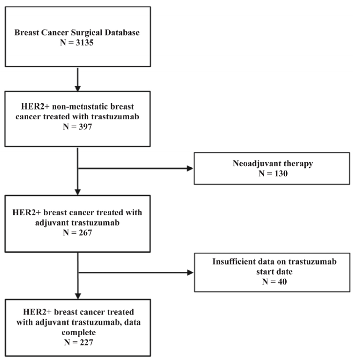 尽管不同研究存在异质性,但这些初步结果提示,在辅助治疗中延迟启动曲妥珠单抗治疗可能产生负面影响[1]。此外,过去十年来的HER2阳性辅助治疗方案发生了显著变化,需要在当前背景下分析这种影响并进行有意义的随访。因此,本研究旨在探讨及时启动辅助曲妥珠单抗治疗对未接受过新辅助治疗的HER2阳性患者的影响。