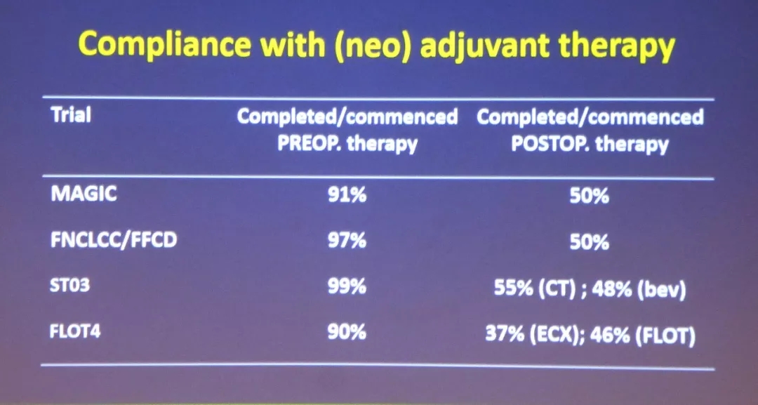 Leong教授小结了这4项研究中辅助治疗的依从性,发现术前化疗的依从性均达到90%以上,而进行胃癌手术后的依从性仅在50%左右,这跟胃癌术后的消化道重建从而导致的胃肠功能下降、高营养不良发生率有关。Leong教授回顾了两项胃癌术后辅助放化疗研究(INT0116和CRITICS)后,指出术前新辅助放化疗的优势:更好的耐受性、肿瘤降期从而提高R0切除率、提供观察远处转移的时间窗以及体外药敏实验评估等优势。