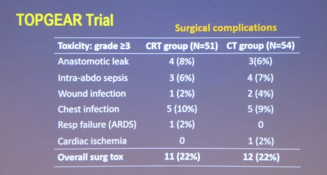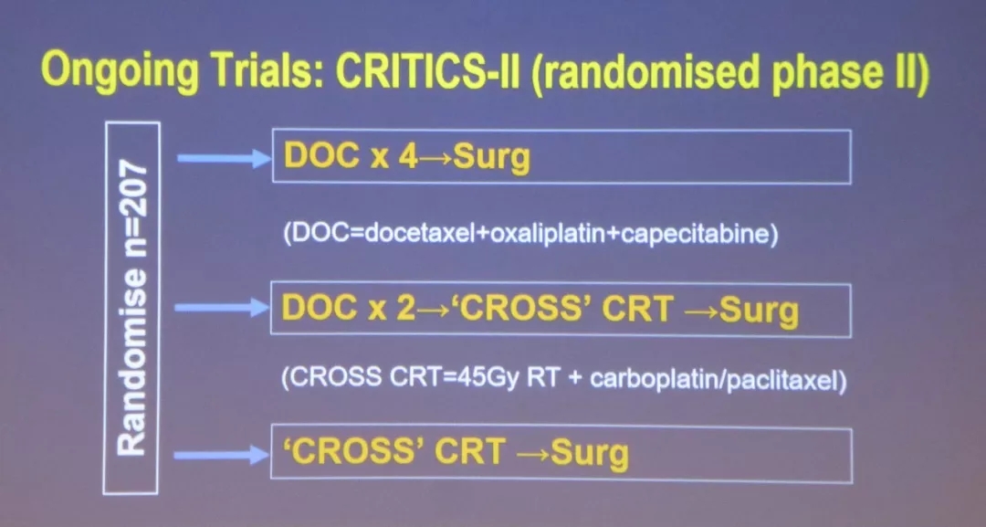最后,Leong教授表示,目前TOPGEAR研究仍在继续入组中,他也非常期待目前仍在入组的两项多中心RCT结果:一项是CRITICS-II研究,将通过3组的术前治疗方案来探索最优的治疗策略,而另外一项则是我国中山大学肿瘤防治中心周志伟教授牵头的多中心的3期随机对照临床试验(Neo-CRAG),主要通过比较围手术期放化疗和围手术期化疗的生存率,最终探索新辅助放化疗的意义。