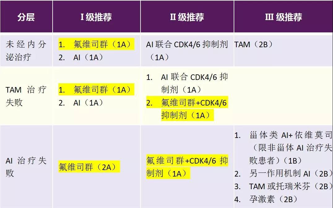 对照2018版CSCO BC诊疗指南,2019版指南主要发生了以下几个方面的更新:(1)对于未经内分泌治疗的患者,Ⅰ级推荐中氟维司群与AI顺序对调;Ⅱ级推荐中AI联合CDK4/6抑制剂证据级别由1B调整为1A。(2)对于TAM治疗失败的患者,Ⅰ级推荐中氟维司群与AI顺序对调;Ⅱ级推荐中AI联合CDK4/6抑制剂证据级别由1B调整为1A;增加“氟维司群+CDK4/6抑制剂(1A)”。(3)对于AI治疗失败的患者,Ⅱ级推荐中氟维司群+CDK4/6抑制剂证据级别由1B调整为1A;Ⅱ级推荐中甾体类AI+依维莫司(限非甾体AI治疗失败患者)调整为Ⅲ级推荐。(4)此外,根据ACE临床研究结果,提出西达本胺在晚期乳腺癌领域的应用前景。