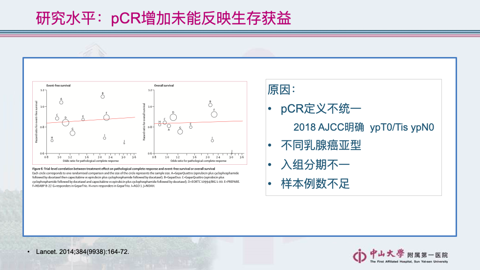 这就好比:柳岩同学如果生于300年前,父母按照标准物色了好对象(辅助方案),但是否真的适合只能看天意,直到婚姻失败(复发)。新时代的女性,通过谈恋爱(新辅助治疗)找到真爱,婚后还要学习卓文君和司马相如,好好“经营”婚姻(未pCR者强化治疗),才能得到稳稳的幸福(改善生存)。