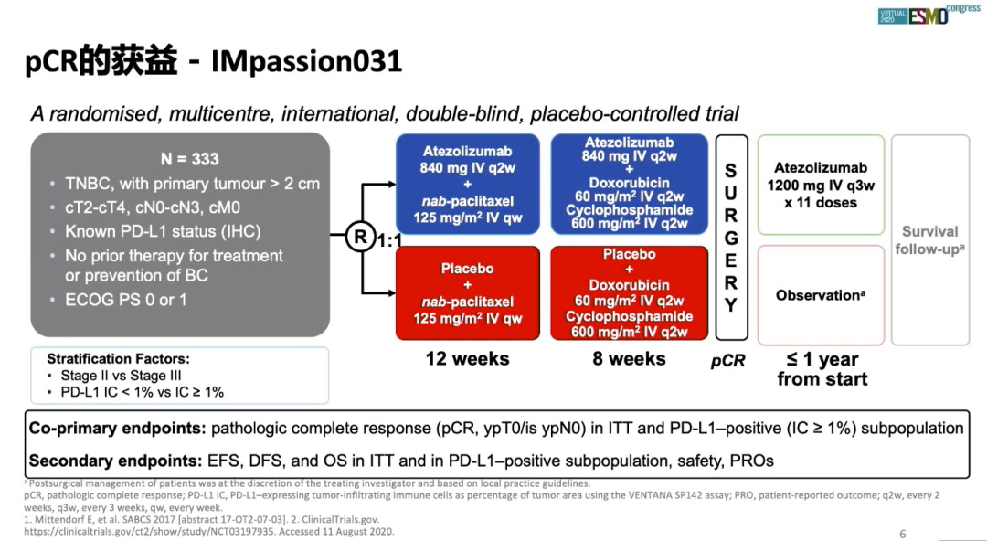 晚期TNBC患者免疫治疗的数据主要来自于KEYNOTE系列研究和IMpassion 130研究,在新辅助治疗领域,2020年ESMO大会报道了IMpassion 031的研究结果,该研究旨在评估阿替利珠单抗(Atezolizumab)联合化疗在早期TNBC新辅助治疗中的疗效和安全性,主要研究终点是病理完全缓解(pCR),定义为ypT0/is ypN0。结果显示与对照组相比,阿替利珠单抗联合化疗,pCR的绝对获益高达16.5%(57.6% vs 41.1%,P=0.0044),次要研究终点PD-L1阳性患者与ITT人群pCR获益一致(58.8% vs 34.8%,P=0.021)。