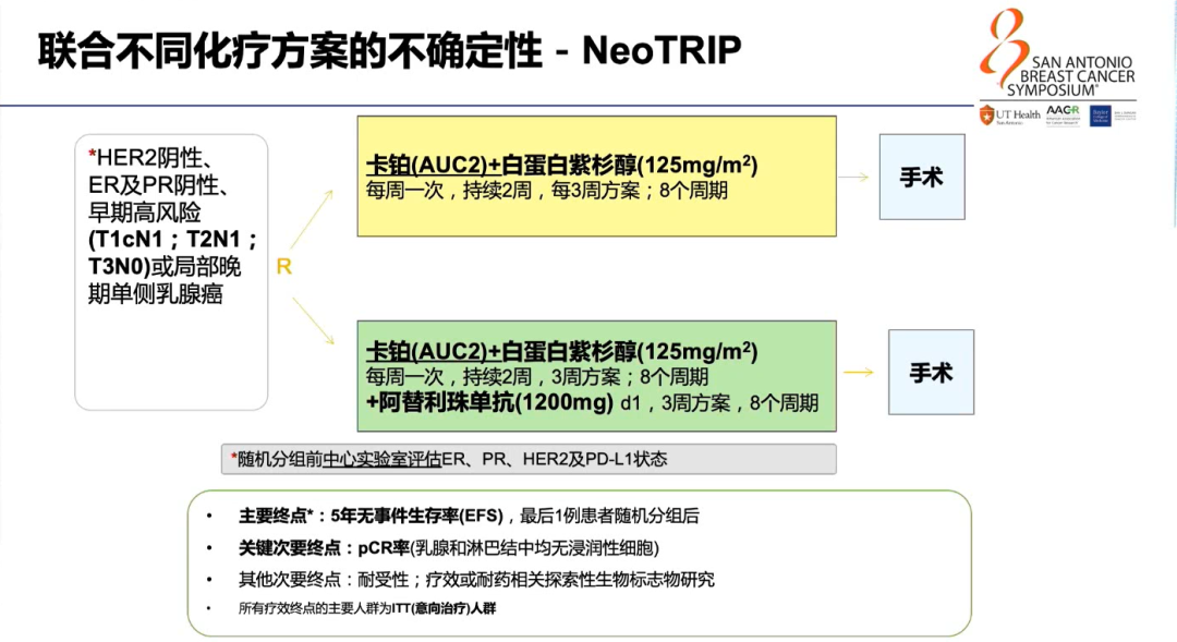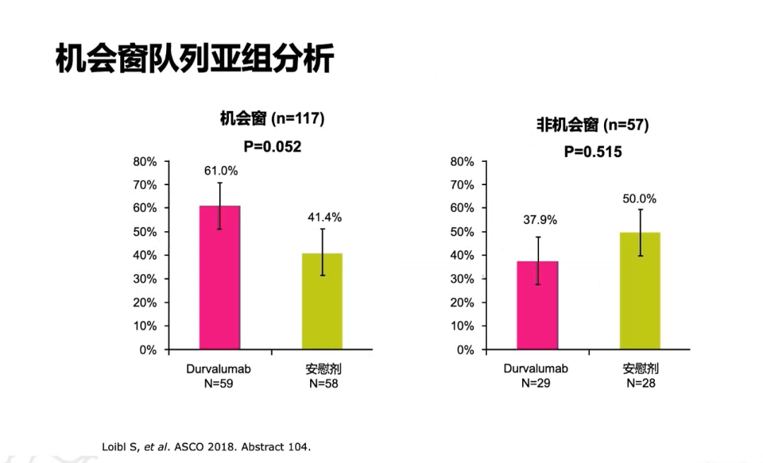 为探索何种配伍能够达到免疫治疗最好的疗效,研究者设计了GeparNuevo研究,该旨在探讨原发性TNBC(cT1b-cT4d,任何cN)患者中,紫杉序贯蒽环新辅助化疗的基础上联合抗PD-L1单抗Durvalumab的疗效。整体上患者pCR率没有显著差异(53.4% vs 44.2%,P=0.287),但预设的亚组分析,机会窗的患者(先在前2周接受Durvalumab或安慰剂单药治疗,然后进行空芯针活检并后续随机)与安慰剂相比,接受Durvalumab治疗的机会窗队列患者pCR率在数值上有明显提高(61.0% vs 41.4%,P=0.052)。该研究提示,未来可以选择化疗药物和免疫检查点抑制剂不同顺序的诱导治疗或选择不同化疗药物进行配伍的优化治疗方式。