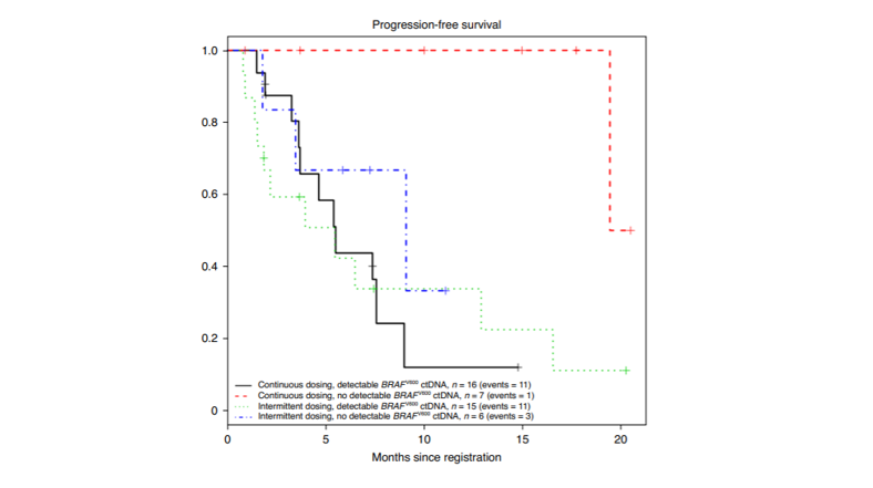 在ctDNA的探索性分析中,治疗前BRAFV600ctDNA阳性患者相较于阴性患者的PFS更差(5.8 vs 21.4个月,P=0.001)。随机分组后可用于分析ctDNA对PFS影响的样本量有限,但一些证据表明,连续给药组中未检测到BRAFV600ctDNA的患者生存更好。