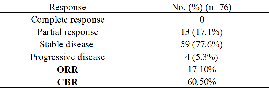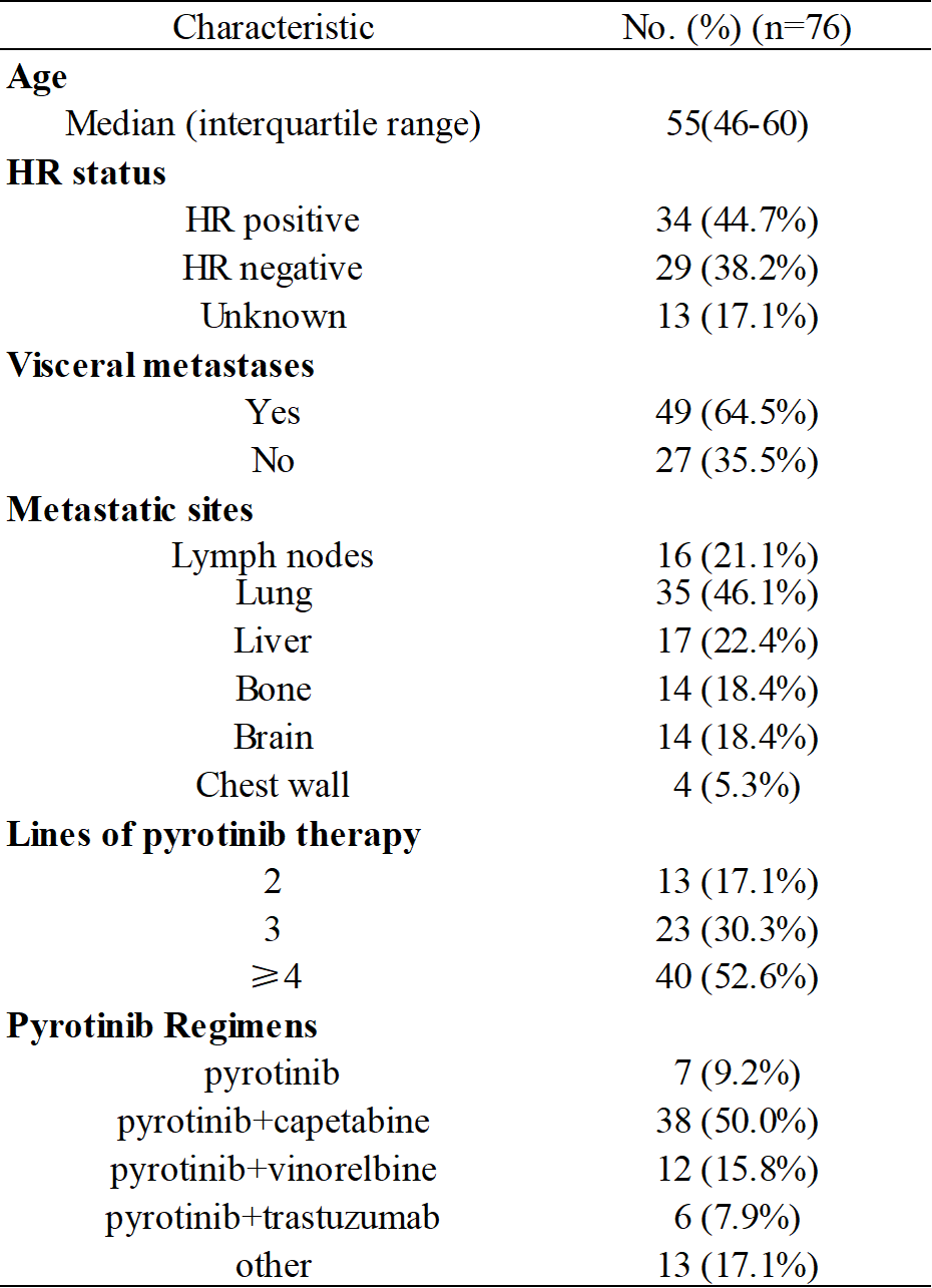 结果:76名患者均在拉帕替尼治疗失败后换用吡咯替尼治疗,其中69名患者(90.8%)接受了吡咯替尼联合化疗,治疗方案包括吡咯替尼联合卡培他滨、长春瑞滨或曲妥珠单抗等,7名患者(9.2%)接收了吡咯替尼单药治疗。