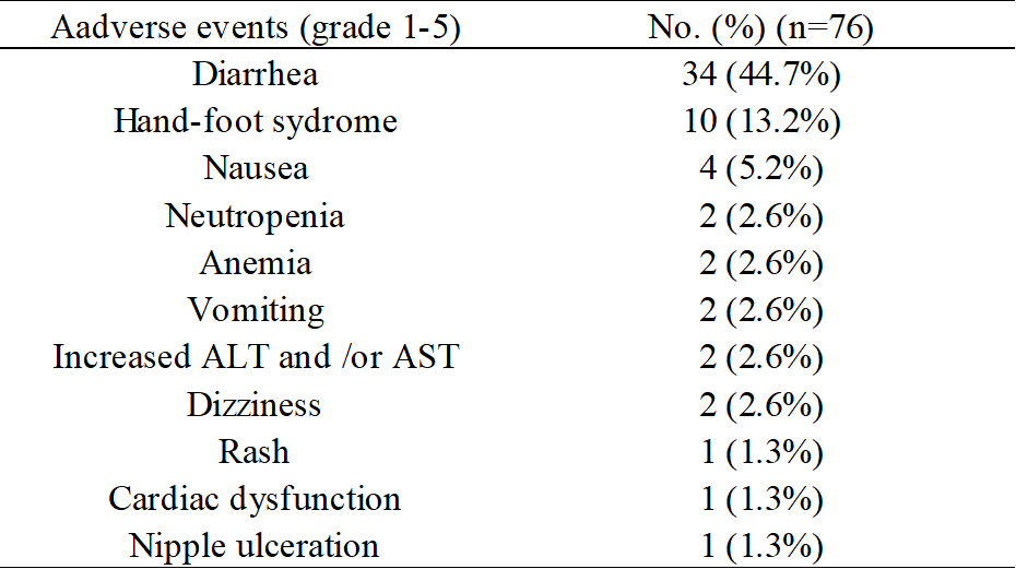 安全性方面,最常见的不良反应为腹泻(n=34,44.7%)及手足综合征(n=10,13.2%)。