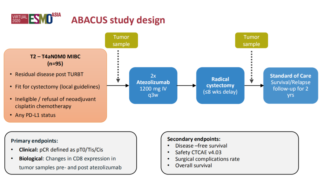 ABACUS是一项单臂Ⅱ期临床试验,目的是探究对拟进行膀胱癌根治术(RC)的MIBC(T2-4aN0M0)患者行两周期的Atezolizumab(阿替利珠单抗,每三周1200mg)治疗的疗效和安全性。试验总共入组了95名对顺铂不耐受或者拒绝新辅助顺铂化疗,并且病理证实为尿路上皮癌的患者(其中8名患者最终未接受RC治疗),病理完全缓解(pCR)为主要研究终点,同时评估免疫治疗副反应以及手术相关并发症。