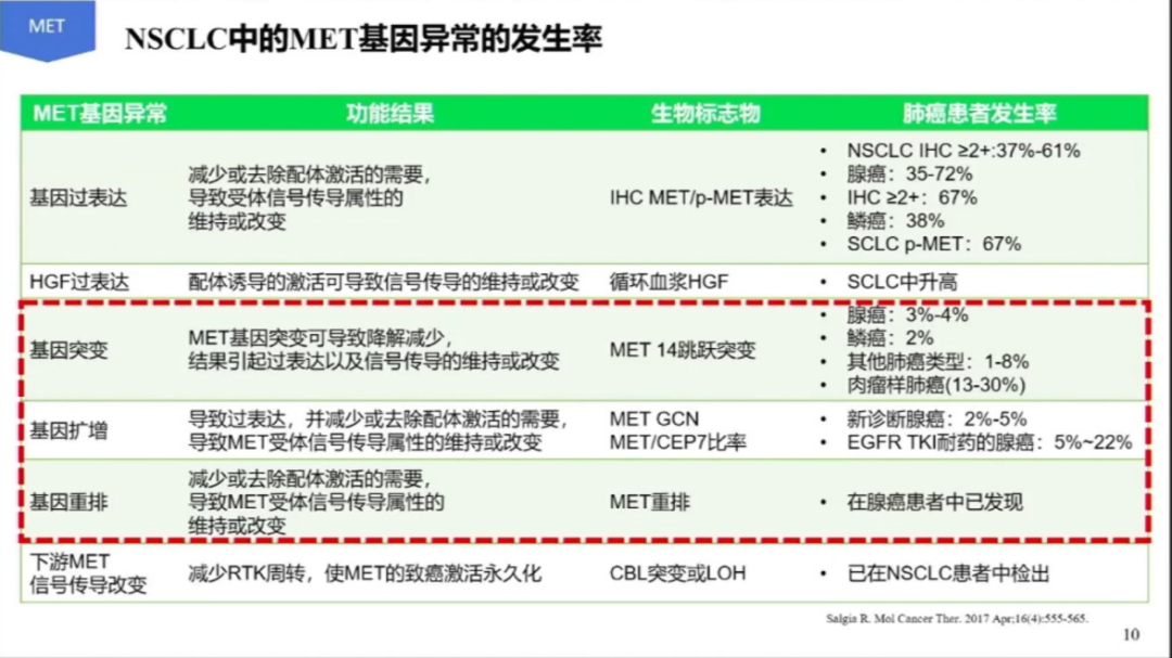 ①MET基因,作为酪氨酸激酶家族重要成员之一,其科技获多个上下游通路,在肿瘤发生中起到了十分重要的信号传导作用。在NSCLC中MET突变的表现形式多种多样,包括MET 14跳读、扩增以及重排等,但在不同亚型中,发生比例不同。如腺癌中只占到3%-4%,但肉瘤样肺癌以及EGFR TKI耐药的患者中突变比例则成倍增加。其中MET 14跳读是业界较为关注的突变之一。