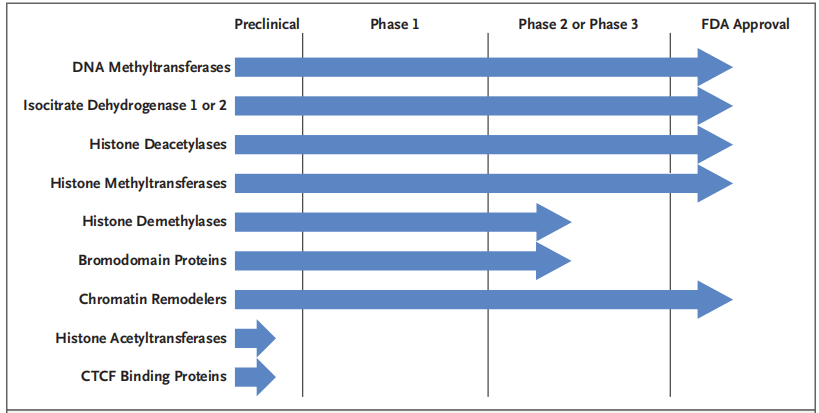此外,表观遗传药物与经典化疗、靶向药物、其他表观遗传药物以及免疫检查点抑制剂的联合应用有望产生协同作用,增加肿瘤患者的反应率,当前有多项DNMT、HDAC或EZH2抑制剂联合免疫检查点抑制剂的研究正在进行。
