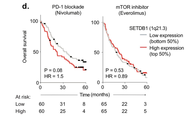当研究人员在小鼠肿瘤模型中阻断SETDB1蛋白,免疫疗法对肿瘤细胞的杀伤作用得以增强,在免疫检查点抑制剂的作用下,肿瘤明显缩小。此外,TCGA数据库中的患者队列数据进一步支持了这个发现,SETDB1基因的扩增与过表达不仅与免疫豁免型肿瘤的形成密切相关,且同样与晚期肾细胞癌PD-1单抗疗效不佳有关。