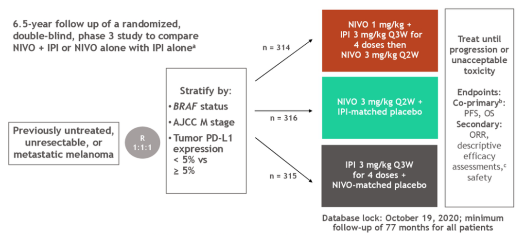 方法:符合入组条件的不可切除III期或IV期初治黑色素瘤患者接受1:1:1随机分配,并按PD-L1状态、BRAF突变状态和转移分期进行分层。患者分别接受 4次NIVO 1 mg/kg + IPI 3 mg/kg, Q3W,之后 NIVO 3 mg/kg Q2W(n = 314)、或NIVO 3 mg/kg Q2W + 安慰剂(n = 316),或 4 次IPI 3 mg/ kg Q3W + 安慰剂(n = 315)治疗,直到疾病进展或出现不可耐受的毒性。研究的共同主要终点是3组的PFS和OS。次要终点包括客观缓解率(ORR)、NIVO + IPI 对照单纯 NIVO 的疗效评估、以及安全性。