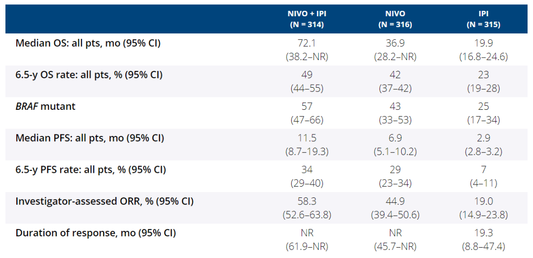 结果:最少随访时间达 6.5 年,NIVO + IPI组的中位OS为72.1个月,NIVO组为36.9个月,IPI组为19.9个月(表1)。从随机到下一线全身治疗的中位时间分别为:NIVO + IPI 组未达到(NR;95% CI:59.6~NR),NIVO组为25.2个月(95% CI:16.0~43.2),IPI 组为8.0个月(95% CI:6.5~8.7);3组分别有36%、49%和66%的患者接受了后续的全身治疗。