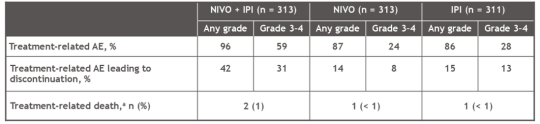 3组的中位无治疗间隔(不包括在开始后续全身治疗前停止随访的患者)分别为 27.6个月(范围,0-83.0)、2.3个月(范围,0.2-81.6)和1.9个月(范围,0.1-81.9)。在存活并接受随访的患者中,3组各有112/145(77%;NIVO + IPI)、84/122(69%;NIVO)和 27/63(43%;IPI)的患者停止试验治疗且一直未接受过后续的全身治疗,各有7、8和0名患者仍在接受试验治疗。3组患者的3/4 级治疗相关不良事件发生率分别为:59%、24%和 28%。自5年分析以后,没有观察到新的安全信息,也没有发生额外的治疗相关死亡。