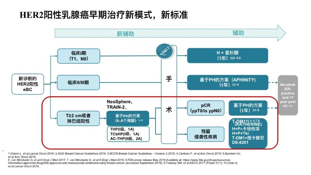 对于新诊断的HER2阳性早期乳腺癌,临床1期(T1,N0)可以直接进行手术治疗,术后辅以H+紫杉或TC4H方案。临床Ⅱ、Ⅲ期没有进行新辅的患者,基于APHINITY研究行HP双靶辅助治疗1年。Neratinib可作为标准治疗后的延长强化手段,在曲妥珠单抗/帕妥珠单抗(新)辅助治疗和/或T-DM1治疗后,今年St.gallen大会63.46%专家支持ER+且非常高危患者应该接受奈拉替尼辅助治疗,如淋巴结≥4个转移患者。