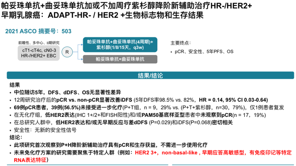 WSG-ADAPT HR-/HER2+研究将HR-,HER2+患者分成两组,一组接受12周的H+P双靶治疗,另外一组接受PH联合紫杉醇单药,进行三周的诱导后行穿刺活检,再完成剩余治疗。研究结果显示,双靶治疗联合紫杉醇组pCR率达到了90.5%,远高于单用双靶治疗组(34.4%)。进一步论证双靶联合化疗是目前的标准方案。今年ASCO报道了生物标志物及生存结果。研究首次观察到P+H降阶新辅助治疗具有pCR和生存获益,不需进一步使用化疗,此研究样本量少,仍需进一步证实。此研究更大价值在于探索未来一些特定优势人群可能免于化疗方案(如:HER2 3+,non-basal-like , 早期应答高敏感型,有免疫印记等特定RNA表达特征)。