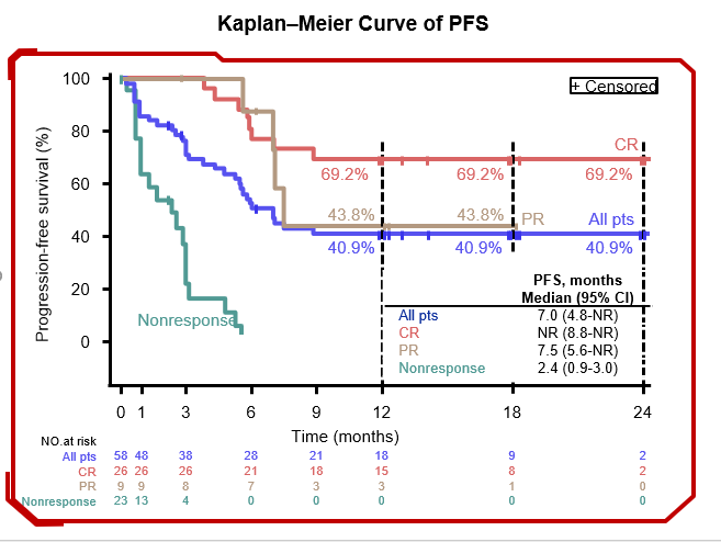 中位随访17.9个月,mITT中所有患者的中位PFS为7.0个月(95%CI4.8-未达到(NR));1年PFS率为40.9%;3个月时达到CR患者人群的中位PFS未达到,6、12、18和24个月的PFS分别为80.8%、69.2%、69.2%和69.2%(图1)。