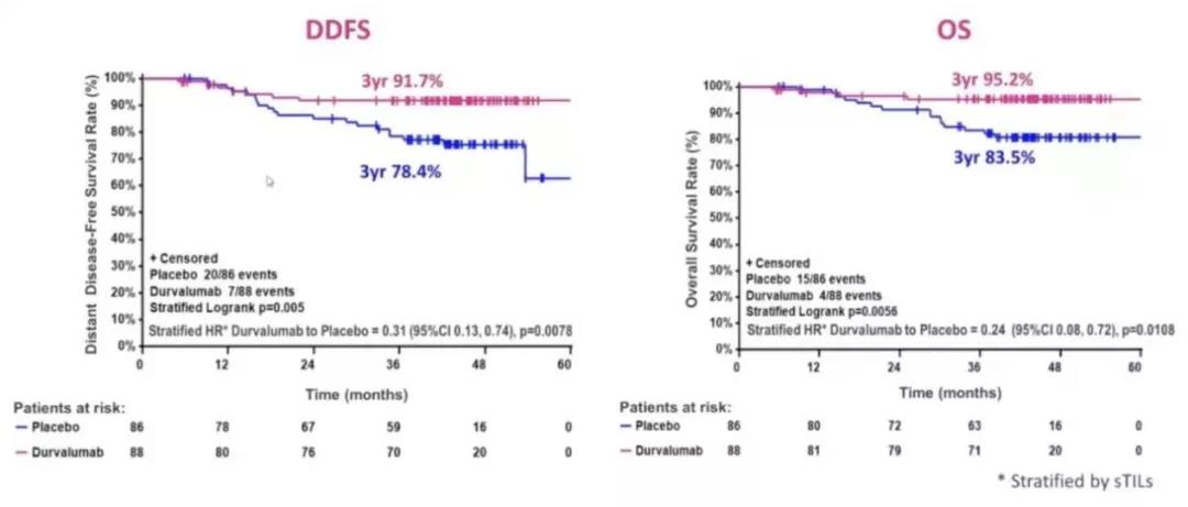 除了帕博利珠单抗外,其它药物也取得了相应进展,也有pCR率的提高或额外的生存获益。Ⅱ期的GeparNuevo研究虽未提高整体人群的pCR率,但是今年ASCO报道的生存数据却显示度伐利尤单抗组的3年DDFS率(91.7% vs 78.4%)和OS率(95.2% vs 83.5%)均有提高。虽然这项研究的主要研究终点并不是患者的生存率,在辅助治疗阶段也并没有继续使用相应的免疫治疗,但它也让我们看到了患者的生存获益,值得我们在今后的研究中做进一步的探索。