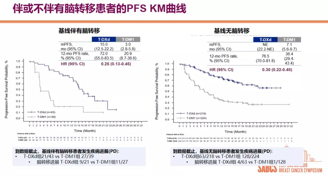 2021年SABCS大会上,DESTINY-Breast 03研究数据再次进行了更新,结果显示,T-DXd治疗方案相比T-DM1在各亚组都展现出持续的疗效获益,且无论患者伴或不伴有脑转移,T-DXd对比T-DM1都表现出了更佳的疗效,T-DXd治疗也可以带来潜在的颅内缓解和减轻中枢神经系统(CNS)疾病。
