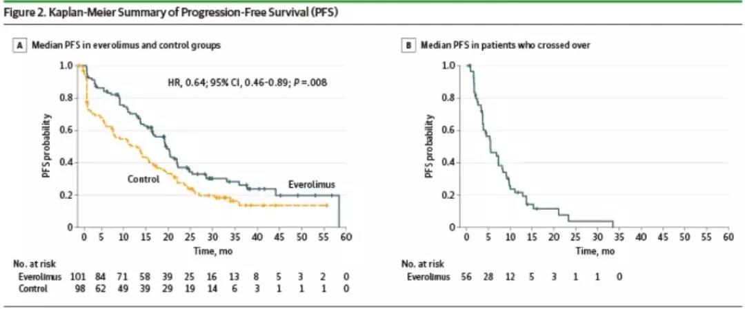 MIRACLE研究中ITT人群(A)和交叉人群(B)的PFS K-M曲线
