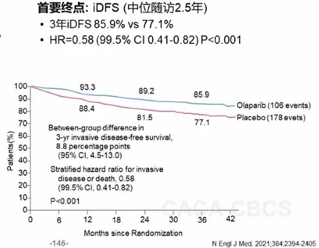 另一项重磅研究是2021年ASCO报道的OlympiA研究,该研究入组了胚系BRCA突变的HER2阴性患者,中位随访2.5年后进行第一次中期分析,结果显示,奥拉帕利治疗组相比安慰剂组,显著改善3年iDFS,两组3年iDFS:85.9% vs. 77.1%,奥拉帕利治疗降低了患者浸润性肿瘤复发或死亡风险达到42%(HR=0.58;99.5%CI:0.41~0.82;P<0.001)。3年的OS率也显示出了获益的趋势,这项研究真正体现了乳腺癌的精准辅助治疗。