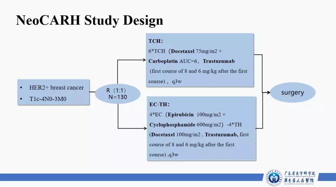 除TKI联合大分子单抗的研究以外,还有关于大分子单抗之间化疗配伍对比的研究。由广东省人民医院王坤教授牵头的neoCARH研究提示豁免蒽环的可能,该研究头对头的比较TCH组和EC-TH组的pCR率,TCH组的pCR率(55.9% vs. 37.3%)和ORR(95.5% vs. 89.4%)均高于EC-TH组。结果提示用更少、毒性更小的药物能够获得疗效上的获益,从而减少患者毒副反应,因此ASCO指南把TCbH联合靶向治疗作为优先推荐。另外,WSG-ADAPT研究也做了一些新辅助降阶梯到无化疗的探索。