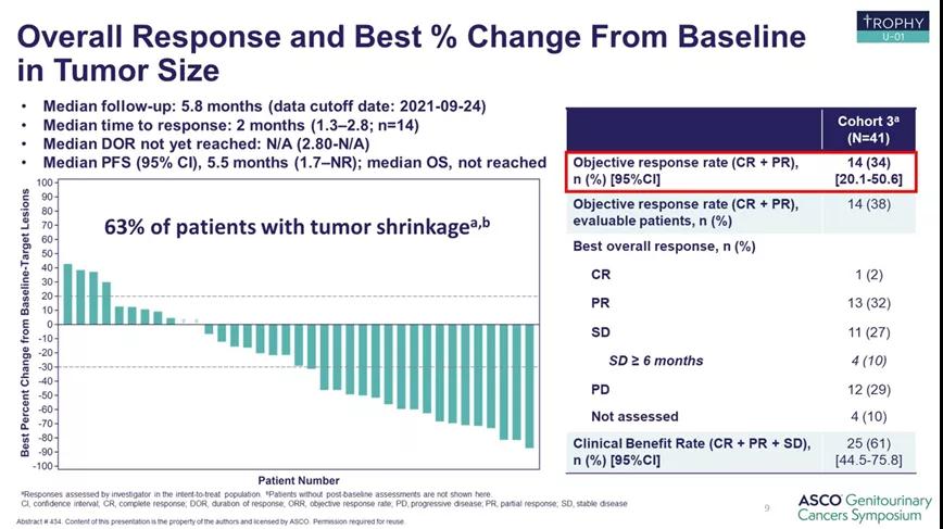 TROPHY-U-01是一项全球多中心的2期研究,队列1是SG单药用于既往含铂方案及免疫治疗失败后的晚期尿路上皮癌患者,既往报道ORR为27.4%,中位OS为10.9个月。本次大会公布了队列3的中期分析结果,探索SG联合帕博利珠单抗在既往铂类治疗失败后的晚期尿路上皮癌中的有效性和安全性,其主要研究终点为研究者评估的客观有效率(ORR)。目前共入组41例患者,中位随访5.8个月,ORR为34%(95%CI,20.1-50.6),63%的患者出现了肿瘤缩小,6个月的PFS率为47%,最常见的治疗相关不良反应包括腹泻(76%)、恶心(59%)、贫血(56%)、中性粒细胞减少(44%)以及无力(41%),其中≥3级AE的发生率为59%,包括腹泻(24%)、贫血(20%)、中性粒细胞减少(27%)以及乏力(7%)等。