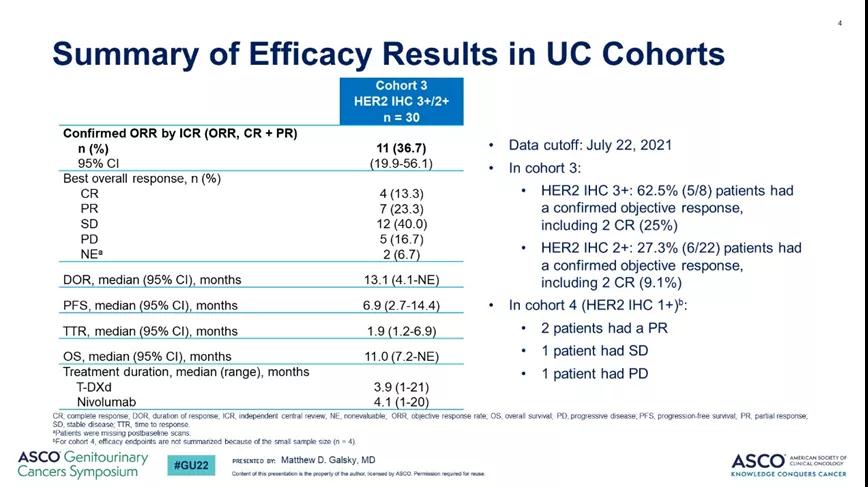 DS8201(T-Dxd)是由靶向HER2的曲妥珠单抗偶联拓扑异构酶抑制剂Dxd组成,近年来在HER2表达阳性或突变的肿瘤包括乳腺癌、胃癌、结直肠癌、肺癌等中展示了出色的疗效,早期临床研究的亚组数据显示其在HER2低表达肿瘤中也可见到客观疗效。本次大会首次披露其在尿路上皮癌中联合免疫治疗的数据,单药临床试验还在进行中。DS8201-A-U105是一项探索DS8201联合纳武利尤单抗用于HER2表达的尿路上皮癌1b期研究,其中队列3和4分别入组既往化疗失败后经过免疫组化确认为HER2(IHC为3+/2+)与HER2(IHC为1+)表达的晚期尿路上皮癌患者,主要研究终点为最大耐受剂量/推荐扩展剂量和独立影像评估的ORR。