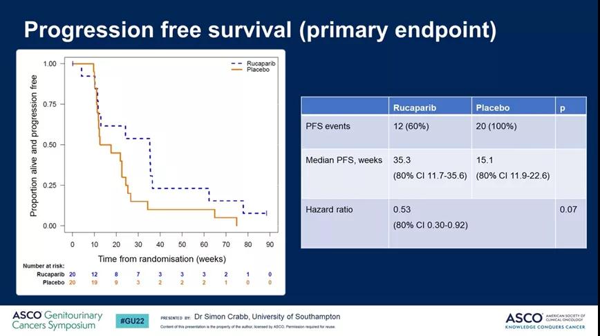 ATLANTIS研究是一项多重对照的II期临床研究,探索不同生物标志物下、不同方案一线维持治疗的疗效。本次大会公布了一线含铂方案治疗后未进展、DRD生物标记物阳性的mUC患者应用卢卡帕利或安慰剂维持治疗的结果,其中DRD阳性定义为≥10%基因组广泛杂合性缺失(LOH)、体细胞突变(ATM、BARD1、BRCA1/2、BRIP1、CDK12、CHEK2、FANCA、NBN、PALB2、RAD51、RAD51B、RAD51C、RAD51D、RAD54L)或BRCA1/2胚系突变。本研究筛选279例患者,DRD阳性率为26.5%,最终纳入40例DRD基因阳性的患者,随机接受卢卡帕利(n=20)或安慰剂治疗(n=20),主要终点为PFS。结果显示,卢卡帕利组中位PFS为35.3周(80%CI,11.7-35.6),安慰剂组为15.1周(80%CI,11.9-22.6)(HR 0.53;80%CI,0.30-0.92,p=0.07)。卢卡帕利组常见TRAE为疲劳(63.2%)、恶心(36.9%)和皮疹(21.1%),≥3级TRAE为乏力、高血压和贫血(均为5.3%)。虽然本研究中DRD阳性患者应用卢卡帕利维持治疗的PFS较对照组有所延长,但鉴于DRD阳性比例不高、统计学设计单侧20%的α值得到P值为0.07以及较小的样本量提示未来还需要进一步的研究。