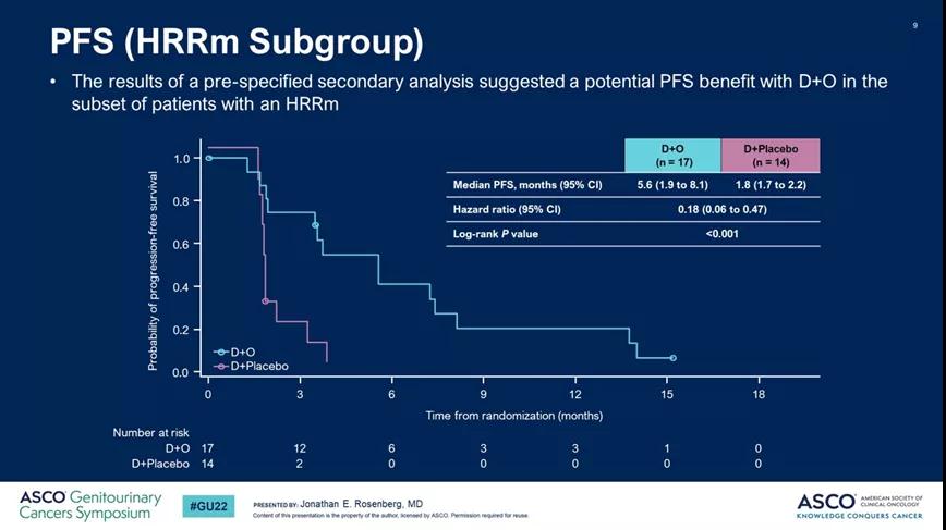 BAYOU研究是一项随机、II期临床研究,纳入154例不耐受铂类治疗的晚期一线UC患者,随机接受度伐利尤单抗联合奥拉帕利(D+O组,n=78)和度伐利尤单抗+安慰剂(D+P组,n=76)治疗,主要终点为IIT人群的中位PFS。结果显示,两组间之间的中位PFS无显著差异,未达到主要终点。在HRRm患者亚组中,D+O组中位PFS为5.6个月(95%CI,1.9-8.1),D+P组为1.8个月(95%CI,1.7-2.2)(p<0.001),具有统计学差异。两组3级和4级AE发生率分别为18%和9%,未观测到新的安全事件。