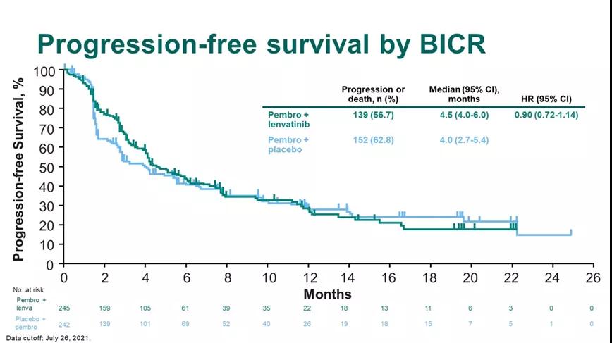 LEAP-011是一项随机、双盲、全球多中心的III期研究,原计划入组694例既往未接受系统治疗的铂类不能耐受的局部晚期或转移性尿路上皮癌患者,要求不能耐受顺铂治疗者PD-L1 CPS≥10、或不能耐受任何铂类治疗不论PD-L1状态。患者随机接受帕博利珠单抗联合仑伐替尼(20mg Qd)治疗或帕博利珠单抗联合安慰剂治疗,主要终点为OS和PFS。其实中期分析显示联合仑伐替尼没有给患者带来更多获益,故本研究提前终止,实际入组了487例。本次ASCO-GU公布了其最终结果显示,两组中位PFS和OS均无统计学意义,帕博利珠单抗+仑伐替尼组和安慰剂组中位PFS分别为 4.5 vs. 4.0个月(HR=0.90; 95% CI, 0.72-1.14),中位OS分别为11.8 vs. 12.9个月(HR=1.14; 95% CI, 0.87-1.48);cORR分别为33.1% vs 28.9%,中位DOR为12.8 vs. 19.3个月。帕博利珠单抗联合仑伐替尼的安全性与以往研究一致。
