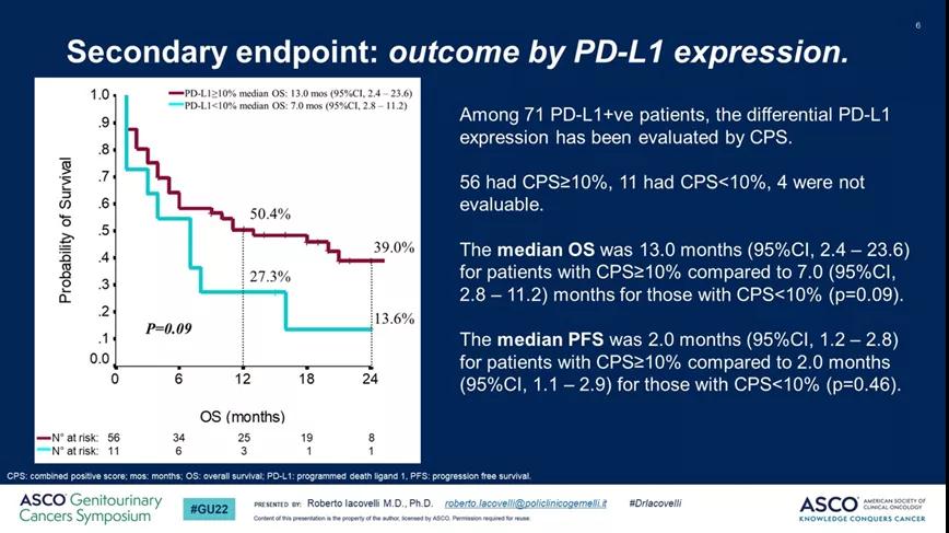 ARIES是一项单臂、开放标签的II期研究,探索Avelumab一线治疗顺铂不耐受、PD-L1阳性的晚期UC患者的疗效和安全性,主要终点为1年OS率。研究定义PD-L1阳性为应用SP263法检测肿瘤细胞表达≥5%,定义顺铂不耐受为为肌酐清除率<60ml/min、ECOG评分2分、2级及以上的周围神经病变或听力丧失,以及既往6个月内进行过顺铂辅助治疗。截至2021年10月7日,研究共纳入71例患者,中位随访9.0个月,中位OS为10.0个月(95%CI,5.7-14.3),1年OS率为40.8%,中位PFS为2.0个月(95%CI,1.4-2.6),cORR为21.1%。应用CPS评分≥10进行分层,两组的OS分别为13.0 vs 7.0个月(p=0.09)。Avelumab疗效及安全性数据与既往PD-(L)1单抗报道的数据相类似。
