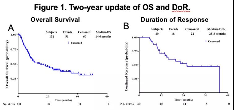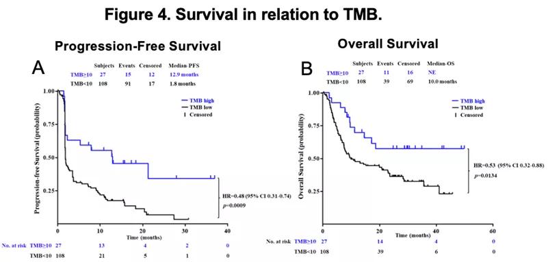 POLARIS-03研究由北京大学肿瘤医院郭军教授和上海交通大学医学院附属仁济医院黄翼然教授共同牵头,应用特瑞普利单抗治疗既往全身治疗失败的晚期尿路上皮癌患者,本次大会更新了2年生存数据以及生物标志物分析结果。2017年5月至2019年9月间,全国15家研究中心共纳入151例晚期尿路上皮癌患者,给予特瑞普利单抗治疗(3mg/kg Q2W),既往已报道主要终点ORR为26.5%。末例患者入组后24个月,中位OS为14.6个月(95%CI,9.3-23.3),中位DOR为25.8个月(95%CI,13.9-43.5)。同时,全外显子组测序结果显示,高水平TMB患者组可以获得更高的ORR、更长的PFS和OS;SMARCA4/PBRM1或肿瘤抑制因子RB1突变、FRFR2/FGFR3基因突变或融合以及NECTIN4基因改变的患者更有可能在特瑞普利单抗治疗后获得缓解。2年的随访期间未发现新的安全信号。