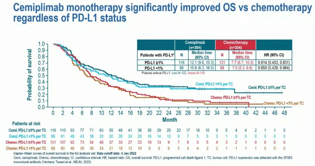 无论患者的PD-L1≥1%(12.1 vs 7.7个月;HR=0.614)还是PD-L1<1%(10.8 vs 7.0个月;HR=0.650),Cemiplimab相比化疗均可显著改善的OS,降低死亡风险。