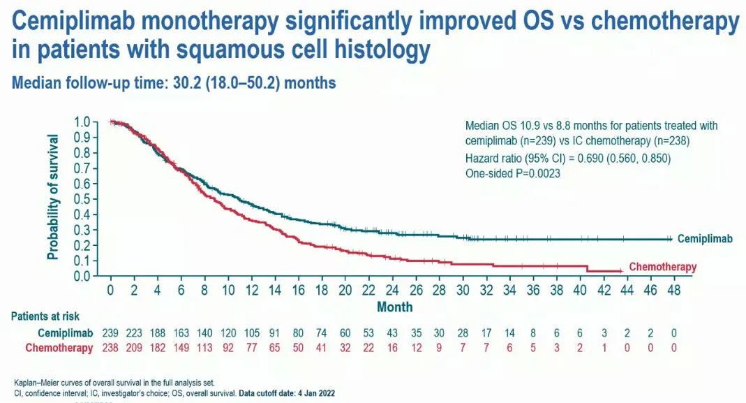与单药化疗相比,Cemiplimab单药治疗显著改善鳞状细胞癌患者的OS(摘要号519MO)