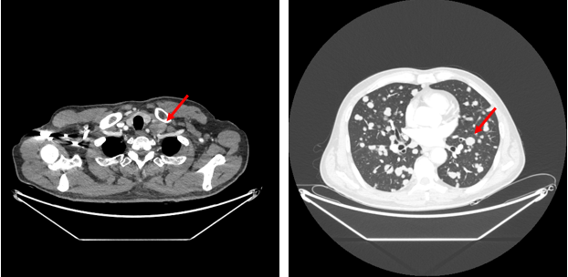 2022年6月2日胸部增强CT:双肺及左锁骨下多发占位,考虑转移。