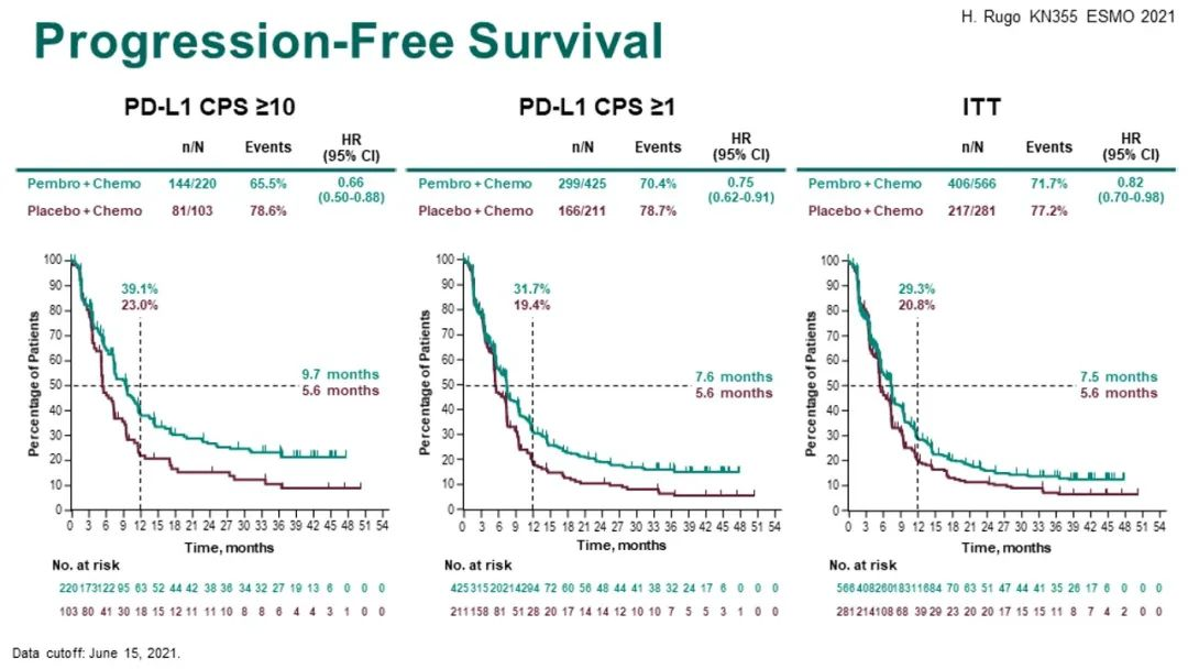 IMpassion130也是一项随机Ⅲ期研究,共纳入902例未接受过化疗的晚期三阴性乳腺癌患者。结果显示在PD-L1阳性(SP142检测PD-L1≥1%为阳性)的患者中,接受阿替利珠单抗联合白蛋白紫杉醇治疗的中位无进展生存期(PFS)较对照组(安慰剂联合白蛋白紫杉醇)延长了2.6个月(7.4个月vs.6.8个月),但在ITT人群中没有看到OS的获益。随后进行的IMpassion131Ⅲ期临床试验,阿替利珠单抗联合紫杉醇对比安慰剂+紫杉醇一线治疗晚期三阴性乳腺癌,在PD-L1阳性人群及ITT人群中,阿替利珠单抗组的PFS和OS均没有获益。