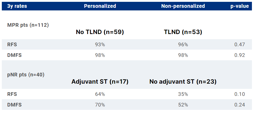 新辅助IPI+NIVO后的MPR患者豁免TLND似乎不会影响RFS/DMFS。考虑到高生存率,辅助全身治疗不太可能给这些患者带来进一步的获益。在pNR患者中,增加辅助全身治疗和持续抗PD-1或改用BRAFi/MEKi似乎可以改善RFS和DMFS。