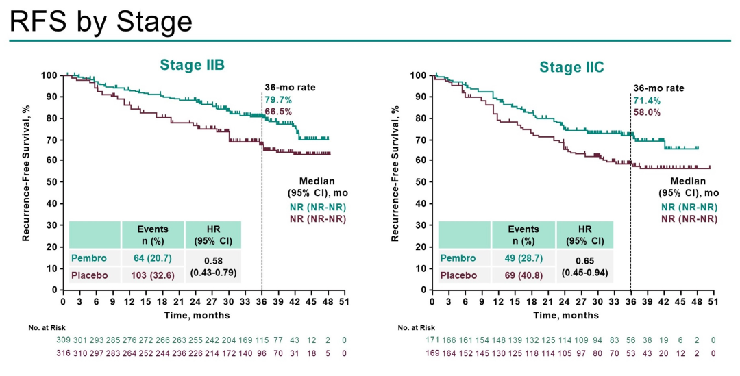 无论基线时的肿瘤分期如何,帕博利珠单抗辅助治疗的DMFS获益均优于安慰剂(ⅡB期HR 0.62,95%CI:0.42~0.92;ⅡC期HR 0.57,95%CI:0.36~0.88)。同样,在RFS方面也获得了类似的结果(ⅡB期HR 0.58,95%CI:0.43~0.79;ⅡC期HR 0.65,95%CI:0.45~0.94)。未观察到新的安全性问题。