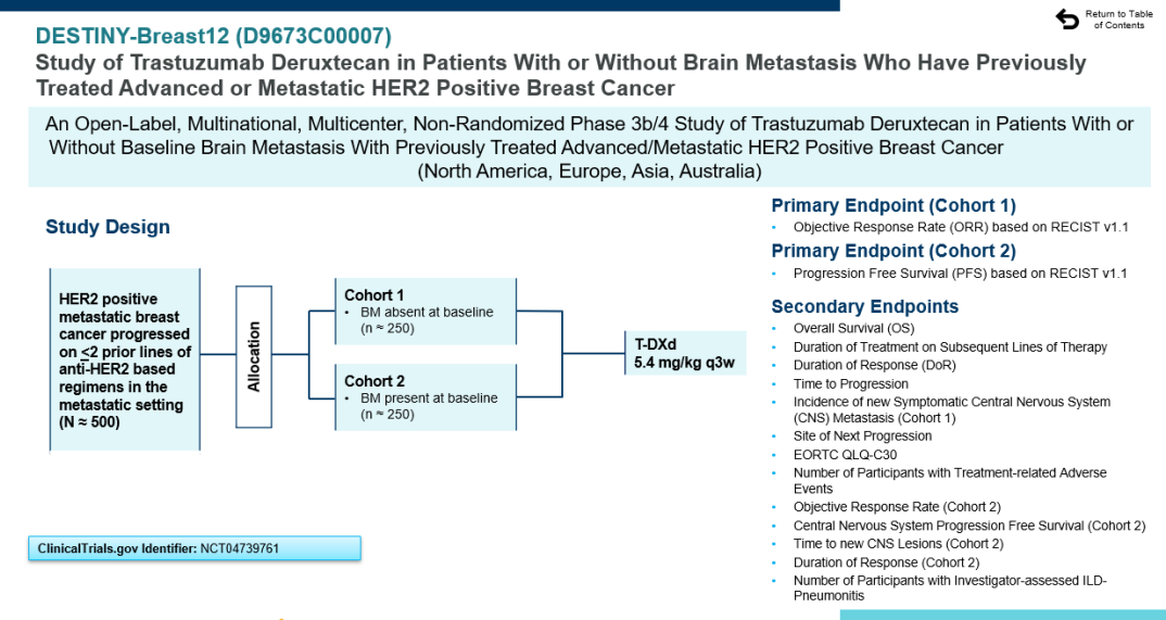 纵观目前针对HER2+脑转移的主要临床试验,同时纳入活动性及稳定性脑转移患者的临床试验较少。未来的试验设计可以参考HER2CLIMB研究作为临床试验设计的参考[2]。DESTINY-Breast12研究作为一项IIIb/IV期临床试验,正在探索T-DXd治疗伴/不伴脑转移的HER2阳性晚期乳腺癌的疗效,期待研究结果的公布。