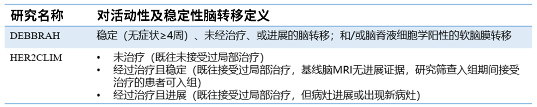目前仍尚无针对有效控制颅内疾病的标准系统治疗方法,针对这一未被满足的临床需求近些年关注度有所增加,较多HER2+脑转移临床试验评估了颅内疗效终点。然而,在这些临床试验设计中观察到了较大的异质性。大多数临床试验(LCCC1025、NCT01004172、NCT02260531、PATRICIA、TUXEDO-1、EGF105084、LANTERN、PERMEATE、TBCRC 022、NCT02308020、LANDSCAPE)纳入了活动性脑转移的患者;而只有两项试验招募了同时具有活动性和稳定性脑转移的患者(HER2CLIMB和DEBRAH);六项试验仅纳入了稳定性脑转移的患者(NEfERT-T,EMILIA,DESTINY-Breast01,DESTINY-Breast03,KAMILLA,NALA),在这六项试验中,仅在DESTINY-Breast01、NEfERT-T、EMILIA、NALA在研究开始前定义了疾病稳定的时间,但具体定义仍存在一定差异,具体请见下方表格。在这些研究中均关注了颅内疗效终点,包括颅内客观缓解率、颅内PFS及中枢神经系统转移进展时间。