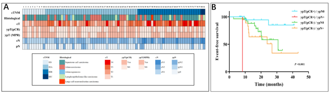 研究共纳入81例接受新辅助免疫化疗治疗的淋巴结阳性NSCLC患者。记录患者的人口统计学特征、影像学和病理学特征。根据原发肿瘤病灶和淋巴结的病理缓解程度,我们将肿瘤病灶(ypT[pCR+])和淋巴结(ypN0)均获得病理完全缓解的患者进一步划分为联合良好反应组,并评估了相关的临床病理特征。无事件生存期(EFS)结果采用Kaplan-Meier分析法进行分析。
