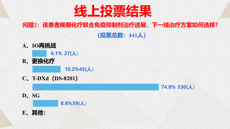 网上医生投票结果揭晓:接近一半(49.8%)的医生投票建议选择化疗联合免疫抑制剂,另有40.3%选择ADC药物。