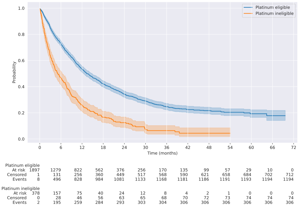 在4270名患者中,2335名(55%)为铂类药物耐受患者,477名(11%)为铂类不耐受患者。由于缺少信息,无法确定其余1458名(34%)患者的铂类药物适用状态。在2335名(55%)接受铂类药物治疗患者中,677名(29%)接受了一线PD-1或PD-L1治疗,1229名(53%)接受了以铂类为基础的化疗方案。在477名不耐受铂类患者中,262名(55%)接受了一线PD-1或PD-L1免疫检查点抑制剂,118名(25%)接受了基于铂类的化疗方案。